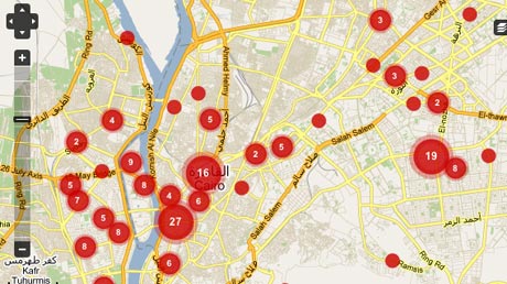 Skärmdump från webbplatsen harassmap.org, på bilden ser man det totala anmälda trakasserier mellan oktober 2004 till mars 2011 i centrala Kairo. På webbplatsen går det även dela upp anmälningarna efter olika kategorier som till exempel "fått kommentarer",