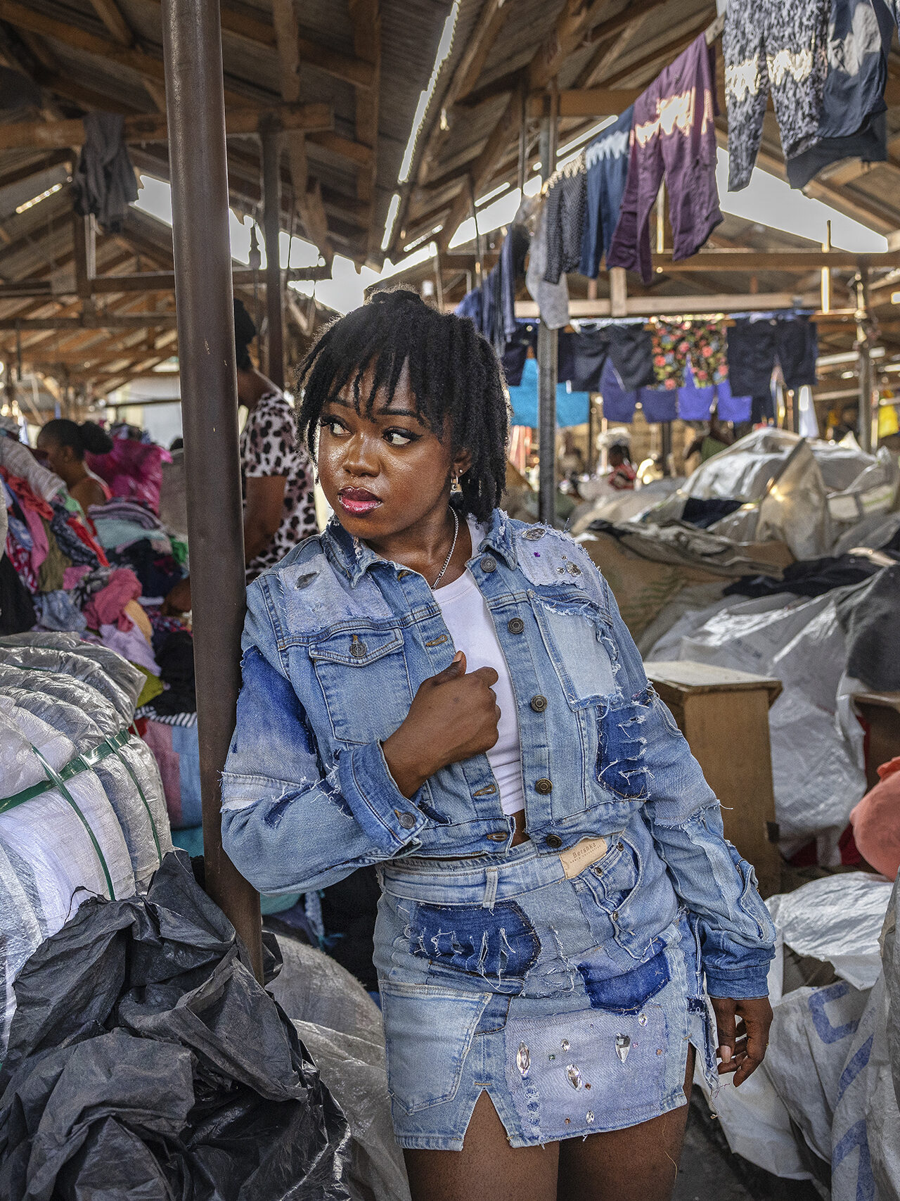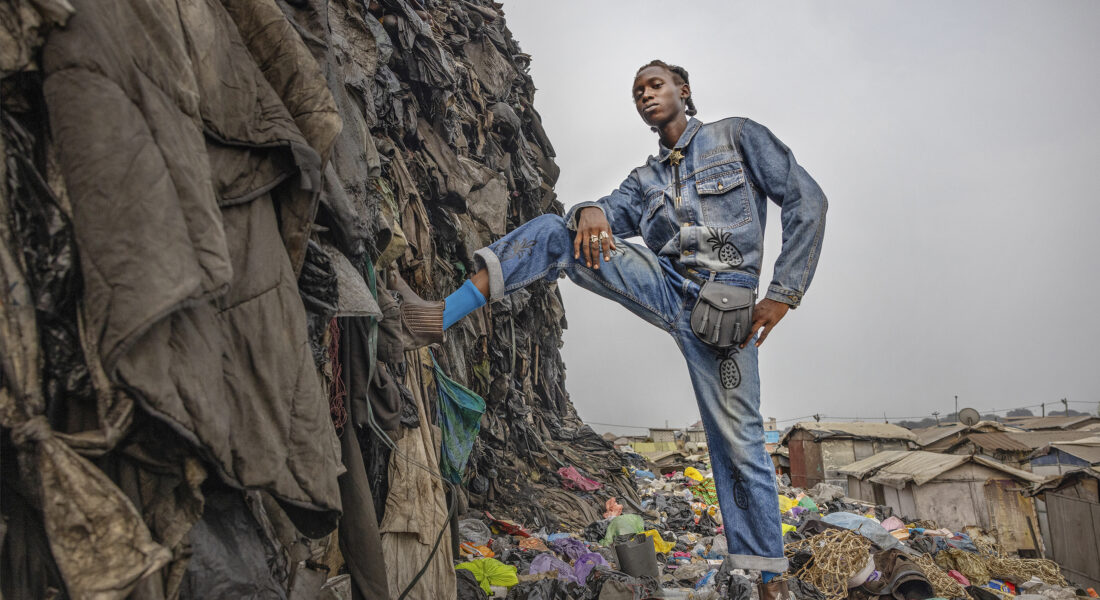 Nabecca Boatemaa, 23, poserar för kameran i egenskapade plagg av denim mitt i ett hav av gamla kläder. Hon flyttade till Accra för att studera media men bytte bana när hon fann skaparglädjen i att jobba med upcycling. Hennes kärlek till jeanstyg har gjort henne populär både lokalt och internationellt.