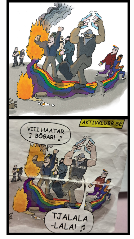 Bilden på stickern är tagen från en artikel Ottar publicerade i juni 2024 som handlar om slagsmålsklubbarnas hat mot Pride, illustrerad av Oscar Andersson. Bilden har manipulerats och används av aktivklubben för att sprida sitt budskap. I den modifierade bilden har en figur i illustrationen fått ljusare hy, text har lagts på en tröja med aktivklubbens hemsideadress, och en pratbubbla med texten »vi hatar bögar« adderats, bland annat.